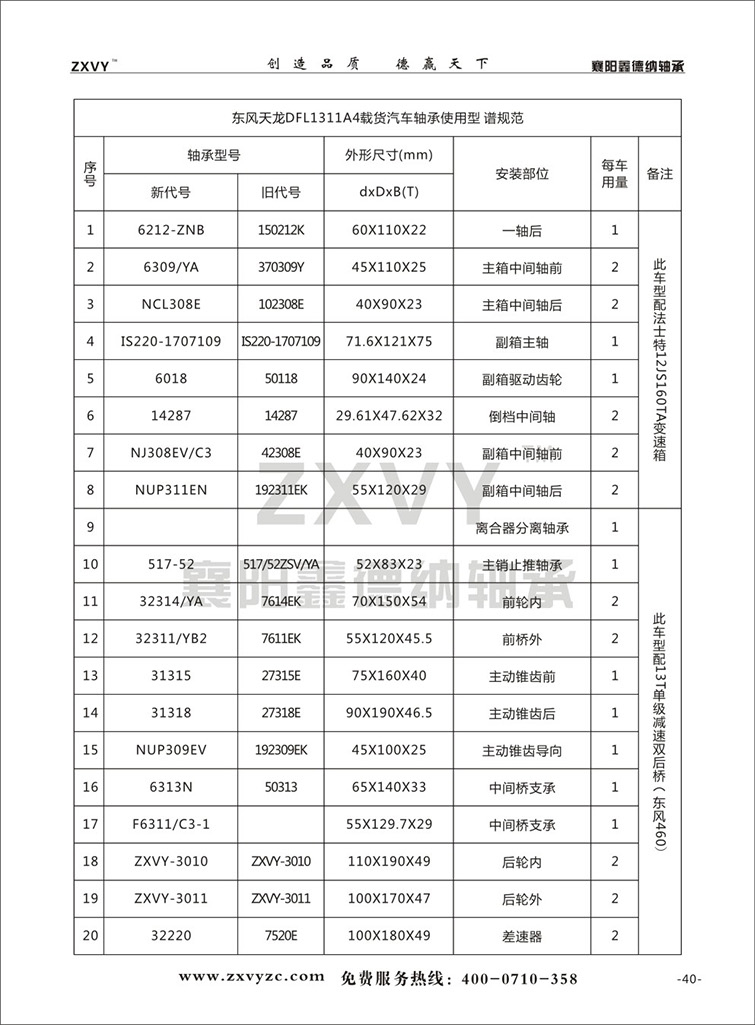 襄阳鑫德纳精密轴承有限公司,始创于1998年,专业制造 鑫德纳ZXVY品牌的高品质轴承及相关产品,是国内轴承行业的领先企业之一,是我国轴承的主要生产基地。公司致力于成为中国轴承企业的标杆,以先进科学的技术、性能可靠的产品和专业周到的服务为用户提供性价比更高的解决方案。鑫德纳ZXVY品牌定位于高端轴承产品的生产研发,我公司专业生产深沟球轴承、圆柱滚子轴承、圆锥滚子轴承、离合器分离轴承、圆锥滚子组合轴承、滚针轴承、角接触球轴承、调心球轴承、推力球轴承、、球面调心滚子轴承等全系列轴承,产品满足东风、解放、重汽、陕汽、华凌、红岩、北方奔驰、大运重卡、三一重工、中联重科、法士特及轻型车系列等车型需求外,还可为用户设计生产微型车、轿车、机械配套及各种非标特殊用轴承;产品远销30多个省市自治区及中东、欧美国家,得到了用户一致认可。